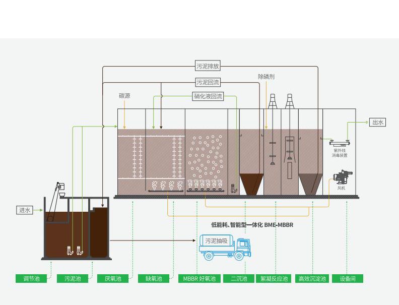 包含厭氧池、缺氧池、MBBR好氧池、二沉池、絮凝反應(yīng)池、高效沉淀池、設(shè)備間及配套輔助等單元。